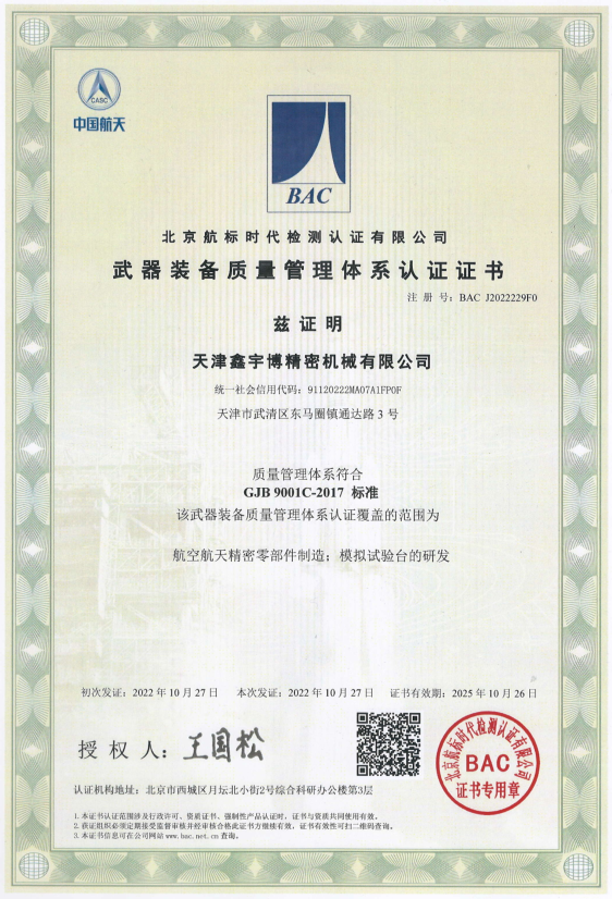 恭喜天津鑫宇(yǔ)博精密機械(xiè)有限公司榮獲國軍標資質證書!