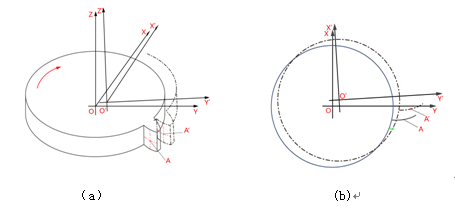 齒輪測量是一個動態測量過程,即齒輪繞回轉中心O旋轉,測(cè)頭沿切(qiē)向X軸直線(xiàn)運動。由於安裝偏心,齒輪的幾何中心與回轉中心(xīn)O不(bú)重合如圖1-2(a)所示(shì),直接引起被測點基圓半徑的變化如(rú)圖1-2(b)所示,由公式(1)可知(zhī),實際測量展長隨著基圓半徑的變(biàn)化而(ér)變化,展長與展角(jiǎo)不再是線性關係。但在實際測量過程中,測量(liàng)動作保(bǎo)持不變,既而由測(cè)頭讀數直(zhí)接計算齒(chǐ)麵誤差,所得結果包含了安裝偏心引起的測量誤差,使得測量結果不夠準確。如圖1-2(b)所示,在沒有安裝偏心的情況下,被測點為A,安裝(zhuāng)偏(piān)心後測量點為