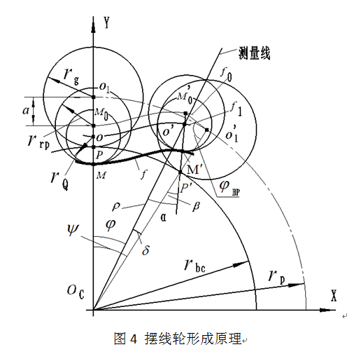 通過采集數據進行(háng)計算並與理論(lùn)擺線、設計擺線的齒廓進行對比,得到(dào)擺線齒輪誤差。擺線齒輪測(cè)量的測頭軌跡曲線(xiàn)是(shì)理論短(duǎn)幅外擺線的等(děng)距曲線(xiàn)[4],它的形成原(yuán)理如圖4所示。