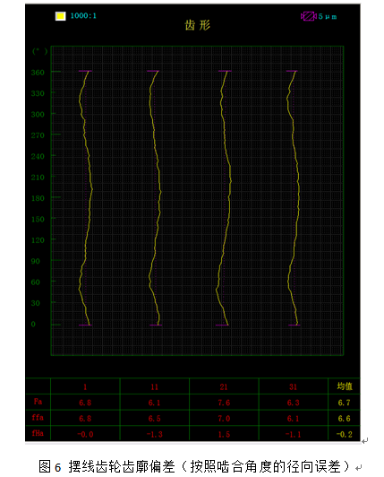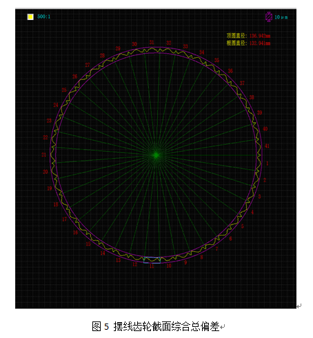 擺線齒輪測量儀通過由極坐標(biāo)測量結合計算機密集采樣的測量原理(lǐ),可以快速的得到擺線齒輪整周的徑向誤差曲線(xiàn),處理得到截麵綜合總偏差,截麵綜(zōng)合總偏差表示擺線齒輪(lún)整轉的誤差情況,實踐(jiàn)中(zhōng)可以快(kuài)速(sù)判斷擺(bǎi)線齒輪的加工情況,結果如圖5所示。
