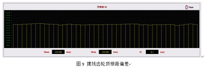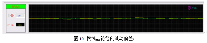 頂(dǐng)根距偏差和徑向跳動(dòng)誤差由已經測量出擺線(xiàn)齒輪整周的數據,通過數據處理,可(kě)以得(dé)到全部頂根距誤差變動曲線和徑(jìng)向跳動誤差變動曲線,測量偏(piān)差結果如圖(tú)9、10所示。
