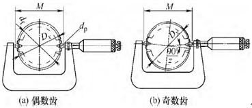 如圖1所示(shì),將直徑相同的兩根圓棒自由地放在齒輪(lún)的相對兩個齒槽內,對於奇數齒,兩圓(yuán)棒應放在中心距為最大弦長的(de)兩個齒槽內(nèi),用千分尺或各種測微儀(yí)、測長儀等計量器具測出兩圓(yuán)棒(bàng)外側最遠點的M值尺寸。測得值與公稱M值之差即為M值的偏差   。將  代入以(yǐ)下公式,即可求出分度圓弦齒厚偏差  :當齒數為偶(ǒu)數時,  ;當齒數為(wéi)奇數時,