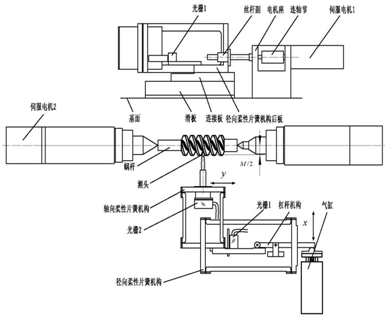 本文(wén)采用(yòng)以測微(wēi)傳感、精密光柵、測頭(tóu)跟隨(suí)運動控製、以單測頭結合(hé)精確定標技術組成工件(jiàn)誤差的精密測量技術實現蝸杆M値的測量,並以此為基礎組成生產現(xiàn)場(chǎng)應用的自動測量線,開拓齒輪在(zài)線(xiàn)測量的新(xīn)方法。如圖(tú)2所示,絲杆副(fù)與徑向柔性片簧機構後板(bǎn)連接,徑向柔性片簧機構後板通過連接板固定在滑板上(shàng)。光柵1讀(dú)取測(cè)頭徑(jìng)向x的位移變化量,光(guāng)柵2讀取測頭軸(zhóu)向y的位移變化(huà)量,伺服電機1驅動絲杆副實現測頭y方向的位移,氣缸帶動杠杆機構實現測頭x方向的位(wèi)移。氣缸帶動杠杆機構在x方向施加測力至蝸杆齒麵,計算機根據光柵1和光柵2讀取的數據(jù)判斷測頭是否進入蝸杆(gǎn)齒槽內,且測頭與蝸杆的齒麵緊密貼合。當判斷測頭完全進入蝸杆齒麵內,且測頭與(yǔ)蝸杆的齒麵緊密貼合後,伺服電(diàn)機2驅動蝸杆旋轉(zhuǎn)一周,與此同時,伺服電機1帶動絲杠(gàng)副使測頭沿蝸杆軸線y方向做跟隨運動。根據光柵1讀取測頭x的位移變化量,即可計(jì)算出蝸杆(gǎn)的平均跨棒距M值。