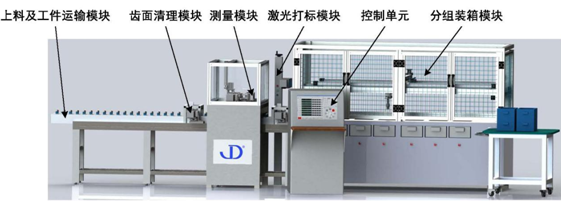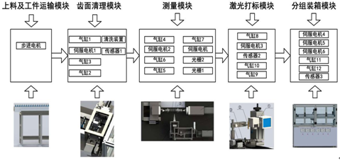 儀器由上料及工件傳輸模塊(kuài)、齒麵清理模塊(kuài)、測量模塊、激光打標模塊、分組裝箱模塊、控製單元組成,如圖4所示。