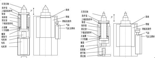 圖(tú)4為右頂尖軸係結構(gòu)示意圖,軸係采用高精度密珠軸承,由軸、軸套以及密集於(yú)兩者之間的具有過(guò)盈配合的滾珠組成。滾珠安放於保持架中,程螺旋線分布,保證(zhèng)了右頂尖軸做旋(xuán)轉運動時的跳動值。端麵保持環為是精密軸係沿著軸向方(fāng)向的兩個支撐點,相當於推力軸承(chéng)作用。止退圈、十字墊圈及螺套配(pèi)合作用,構成軸(zhóu)向定(dìng)位與緊固。選用(yòng)控製(zhì)精度高的交流伺服電機通過連軸器驅動右頂尖軸係(xì)回轉,電機緊固在電機座上,電機座固定在軸套上。軸(zhóu)套固定在滑板上,整(zhěng)個軸係固定在滑板上。氣缸缸體固定在基座上,氣缸活塞與(yǔ)滑板(bǎn)連接,實現軸係(xì)沿軸線y方向的位移(yí)。