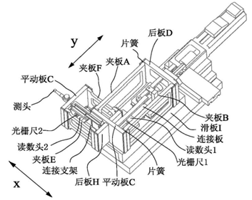 平麵平動板C僅在x方向和平行(háng)於自身(shēn)產生位移,這使平麵平動板C可貼上x向光柵尺,x向的讀數頭通過連接板安裝在後板D上。平麵平動板G僅(jǐn)在y方向和平行於(yú)自身產生位移,這使平麵平動板G可貼上y向光柵尺,y向的讀數頭通過連接支架安裝(zhuāng)在後板H上。